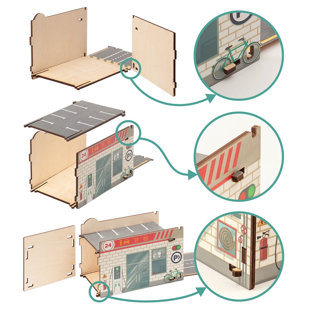 Set contents: assembled garage, Road - 38 parts.