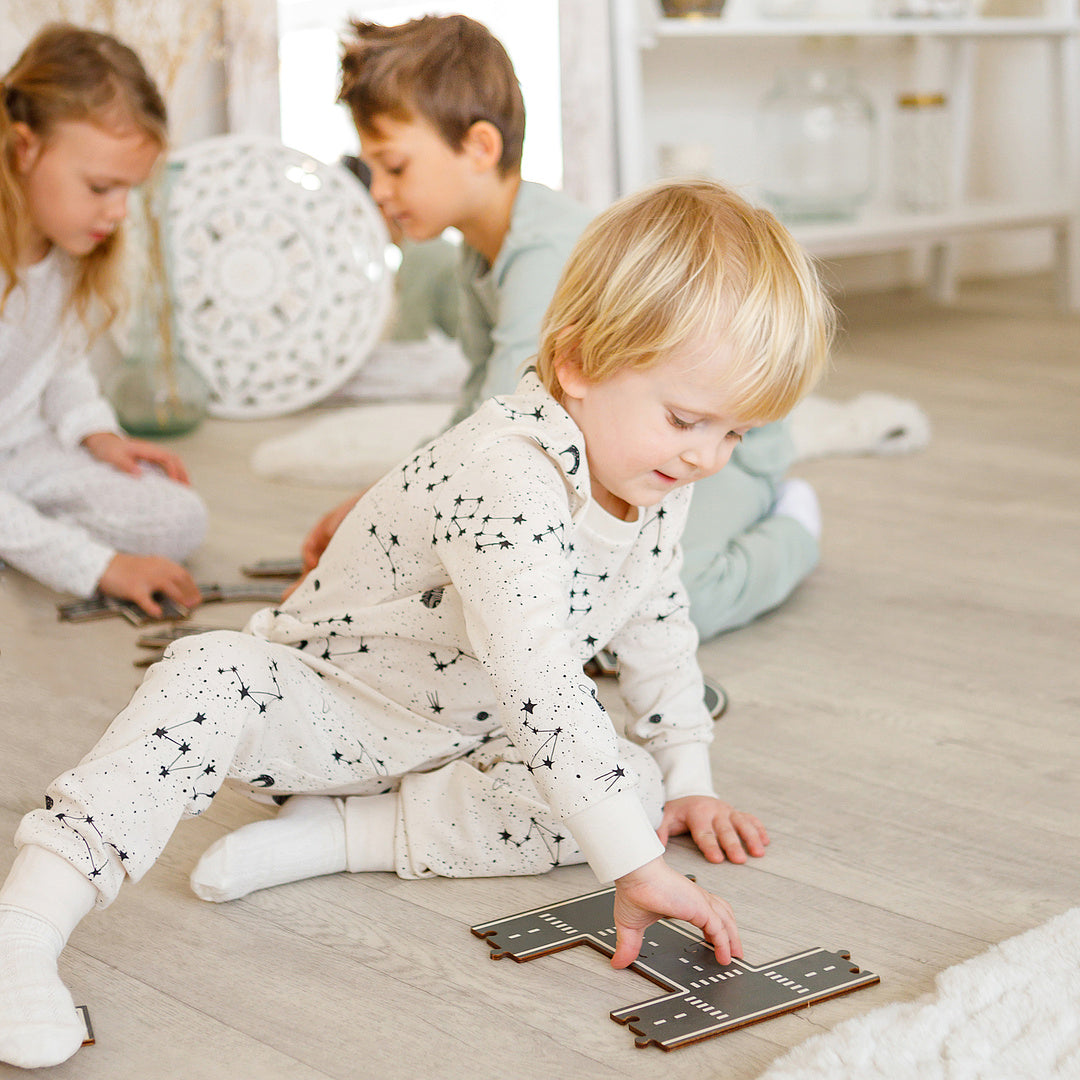 The road can be assembled as a puzzle in many ways. For instructions on how to build a track, use the QR code on the package.