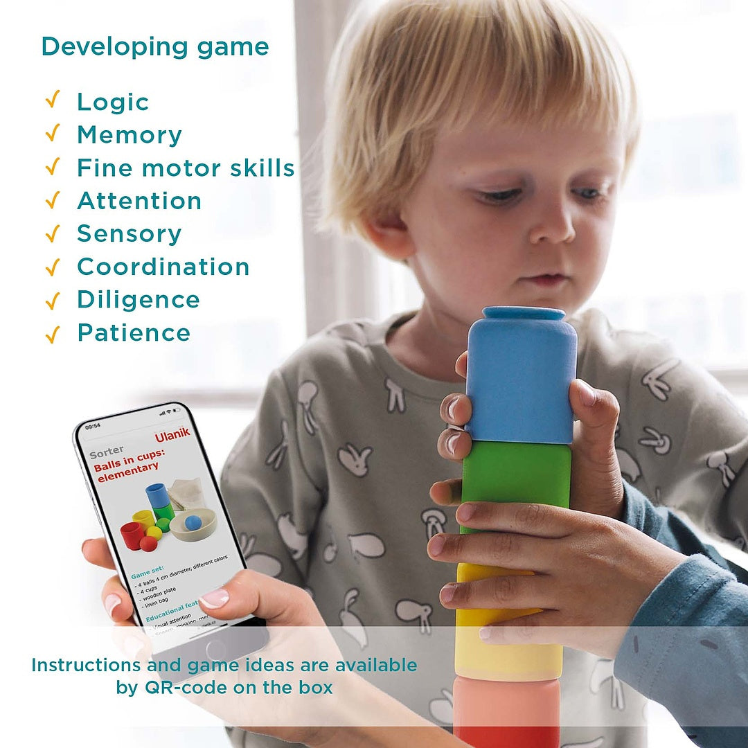 Materials: The balls, cups and bowl are made of solid linden wood. The colored elements are painted with German BIOFA natural wax, which includes components of natural origin only, certified for children's toys. Please note that the natural wax is a delicate cover, so it is not advised to wash it — it's better to use a dry cloth to gently wipe the details. The wax cover is eco-friendly, non-allergic, and safe even for the smallest children. The bag for balls is made of linen fabric. The tray for storage is made of birch plywood.