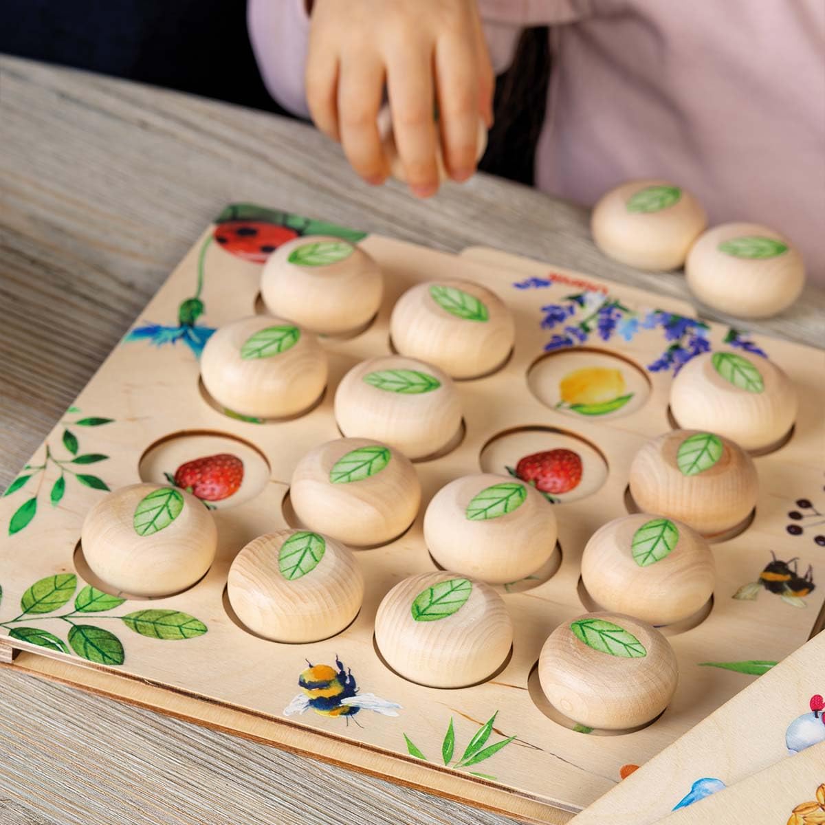The chips for our toddler board games are made of natural solid linden wood. Please note that wood is a durable but water-sensitive material, so it is not advised to wash it — it's better to use a dry or slightly wet cloth to wipe the details gently. The pictures are printed right on the chips to make sure nothing rubs off with time as stickers may do. The tray is made of birch plywood. The game set is eco-friendly and safe for children over 3 years.