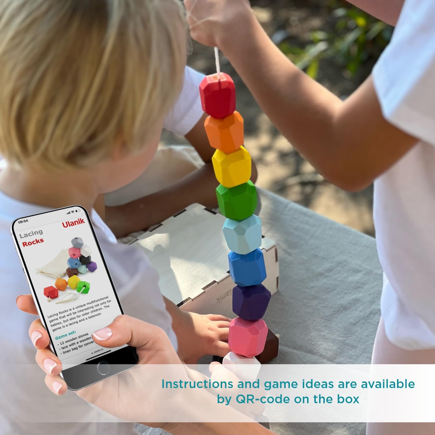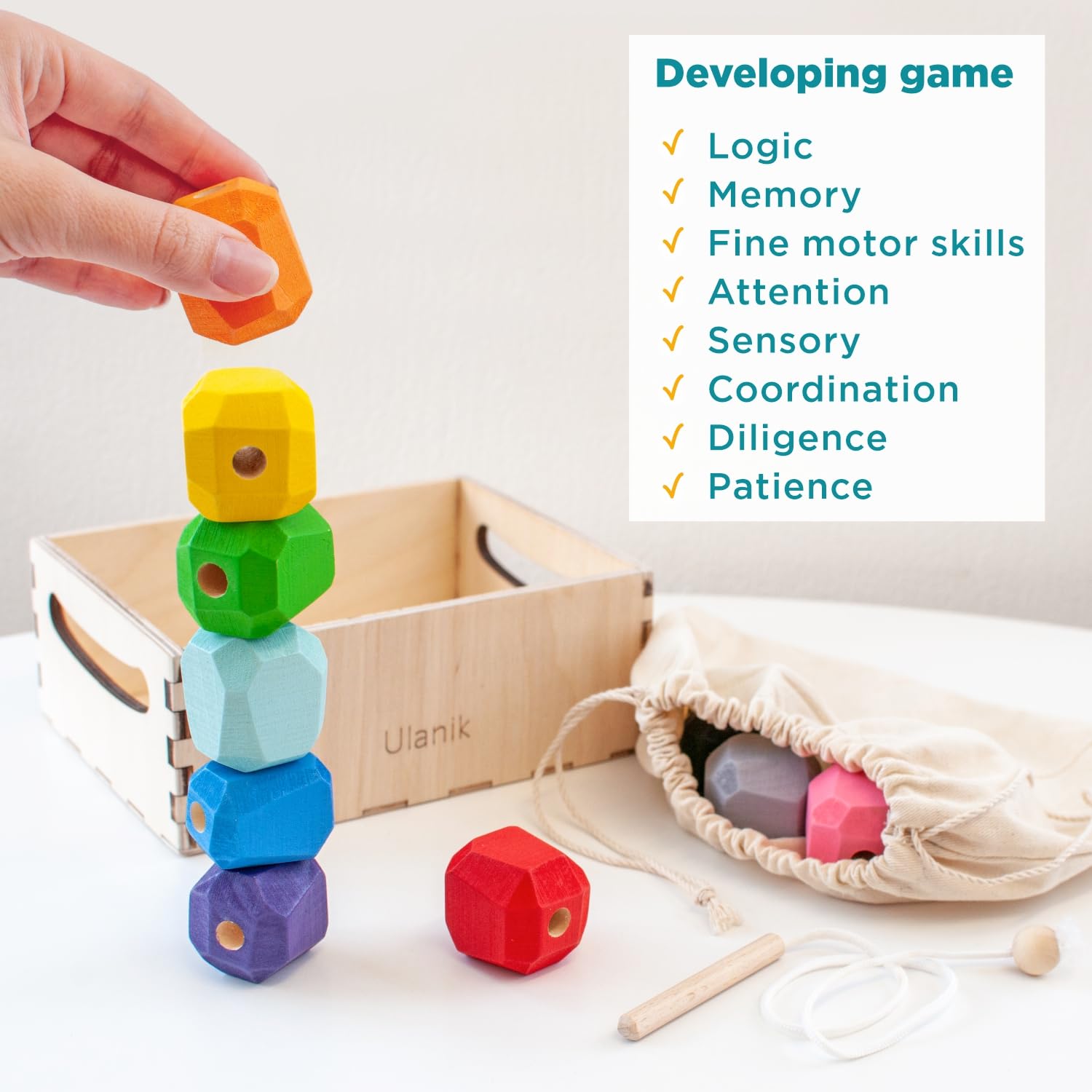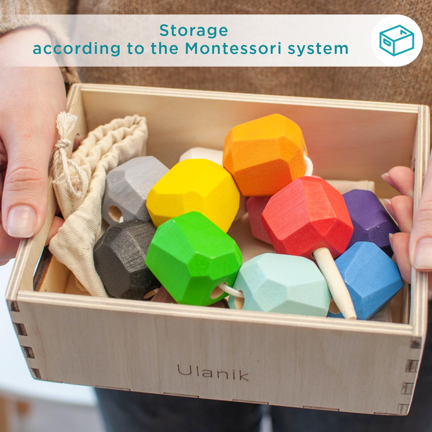 This wooden beads lacing game with balancing rocks aligns with Montessori and Waldorf education methods, encouraging self-guided exploration and discovery. As open ended toys, they perfectly suit both toddlers and older kids and have no limits in inventing imaginative ways to play. There are no extra shades so that the child can easily recognize the primary colours. These Montessori threading toys would become a perfect birthday, Christmas, Easter gift or an addition to the educational collection of preschool toys in a learning group classroom. Also, our learning & education toys are portable and easy to store thanks to the linen bag that would look so nice in your Montessori shelf.