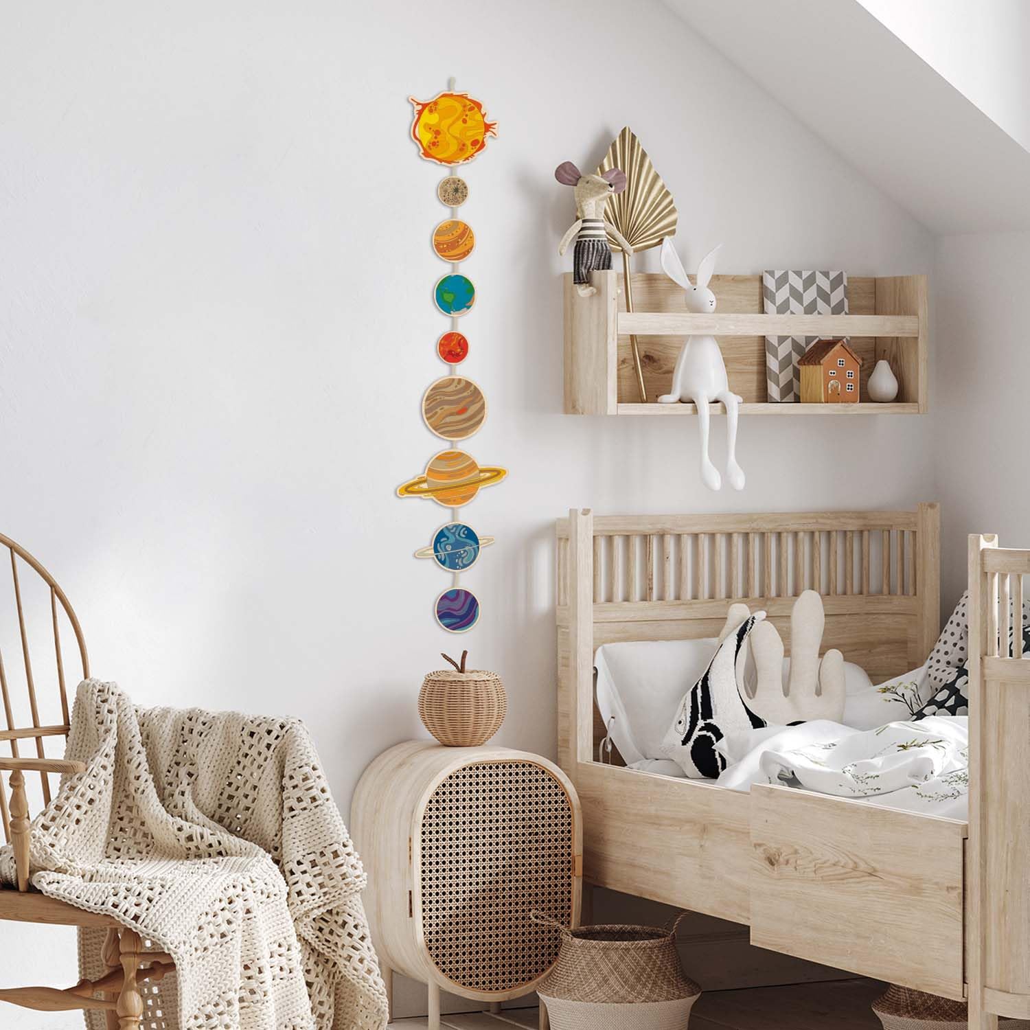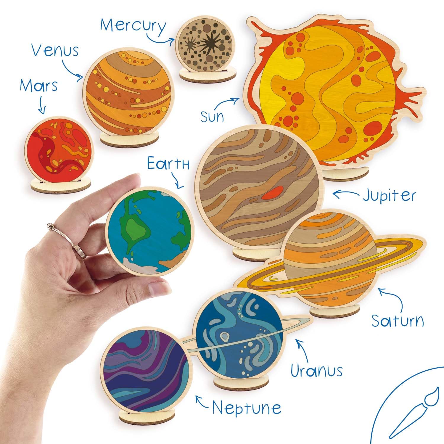 These educational Solar System craft kits for kids are perfect for the creativity, entertainment and cognitive development of toddlers and preschool-age children. This unusual toddler colouring book would become a perfect birthday, Christmas, Easter gift, or an addition to the educational collection of a learning group classroom. It is lightweight and easy to store and display thanks to the wooden stands. You also can glue the planets to ribbons and hang on the wall.